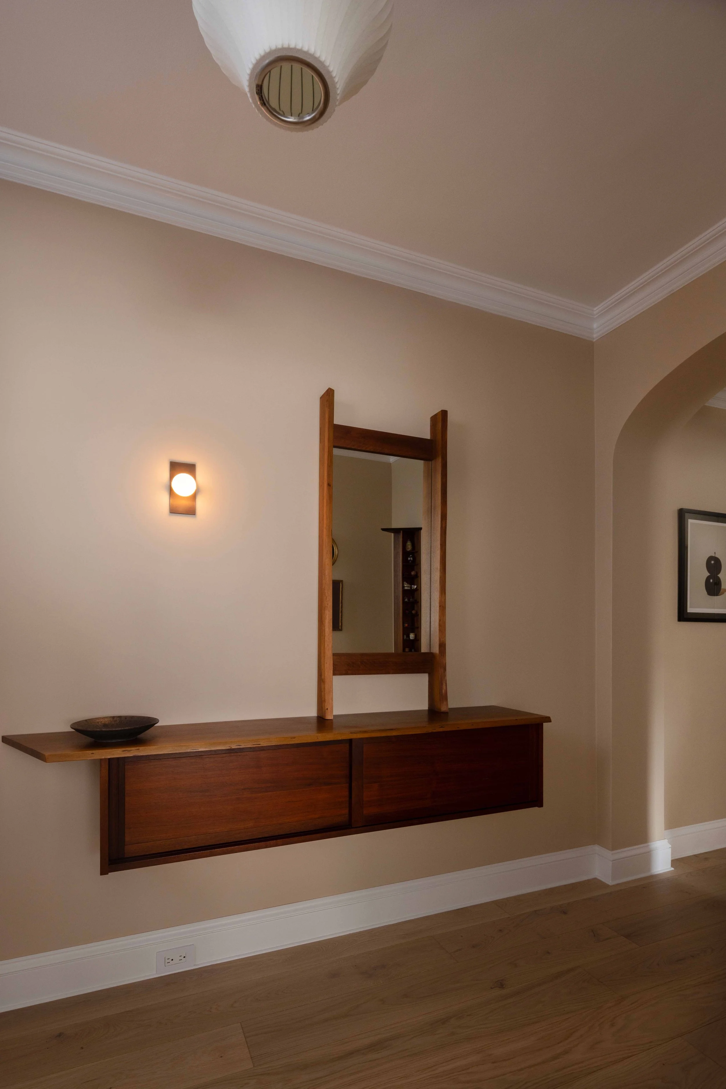 The owners of this pre-war Upper East Side apartment moved in a few years prior to the renovation, bringing with them several unique pieces by woodworker George Nakashima. Seeking a more modern feel to complement the Nakashima pieces, they hired Shadow Architects after seeing the firm’s work in other units within the building. The design team approached the renovation with an eye toward Nakashima’s craftsmanship and ethos.